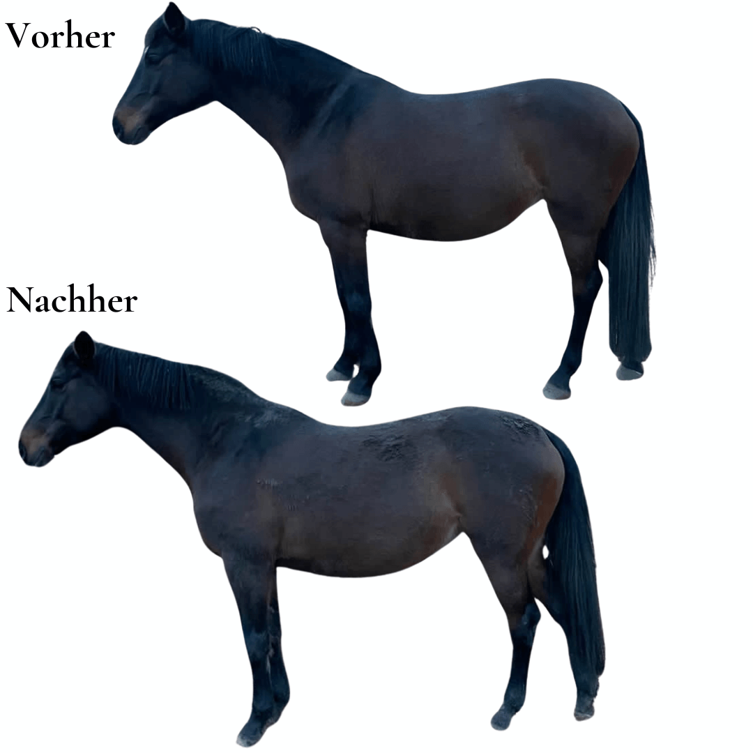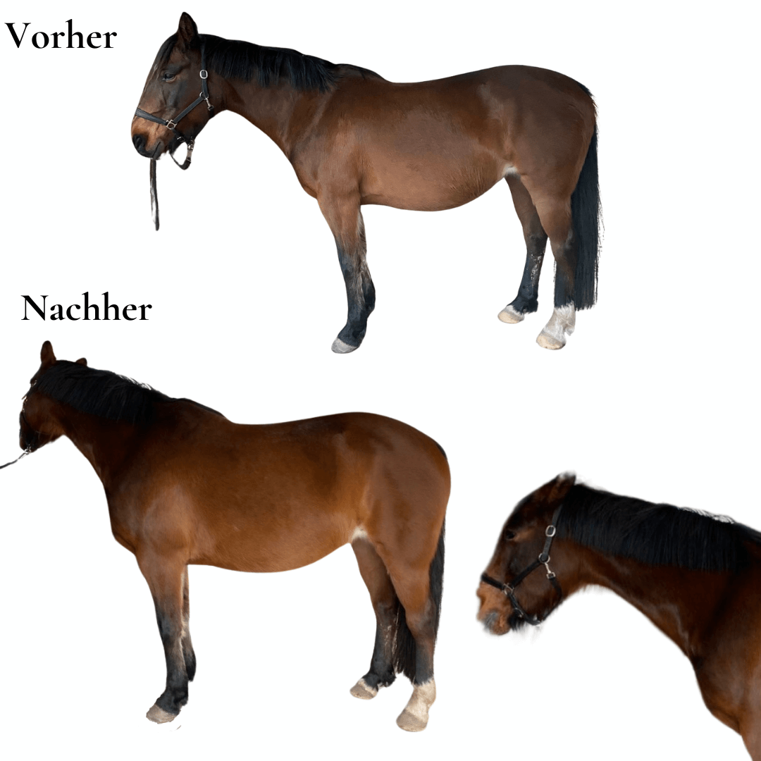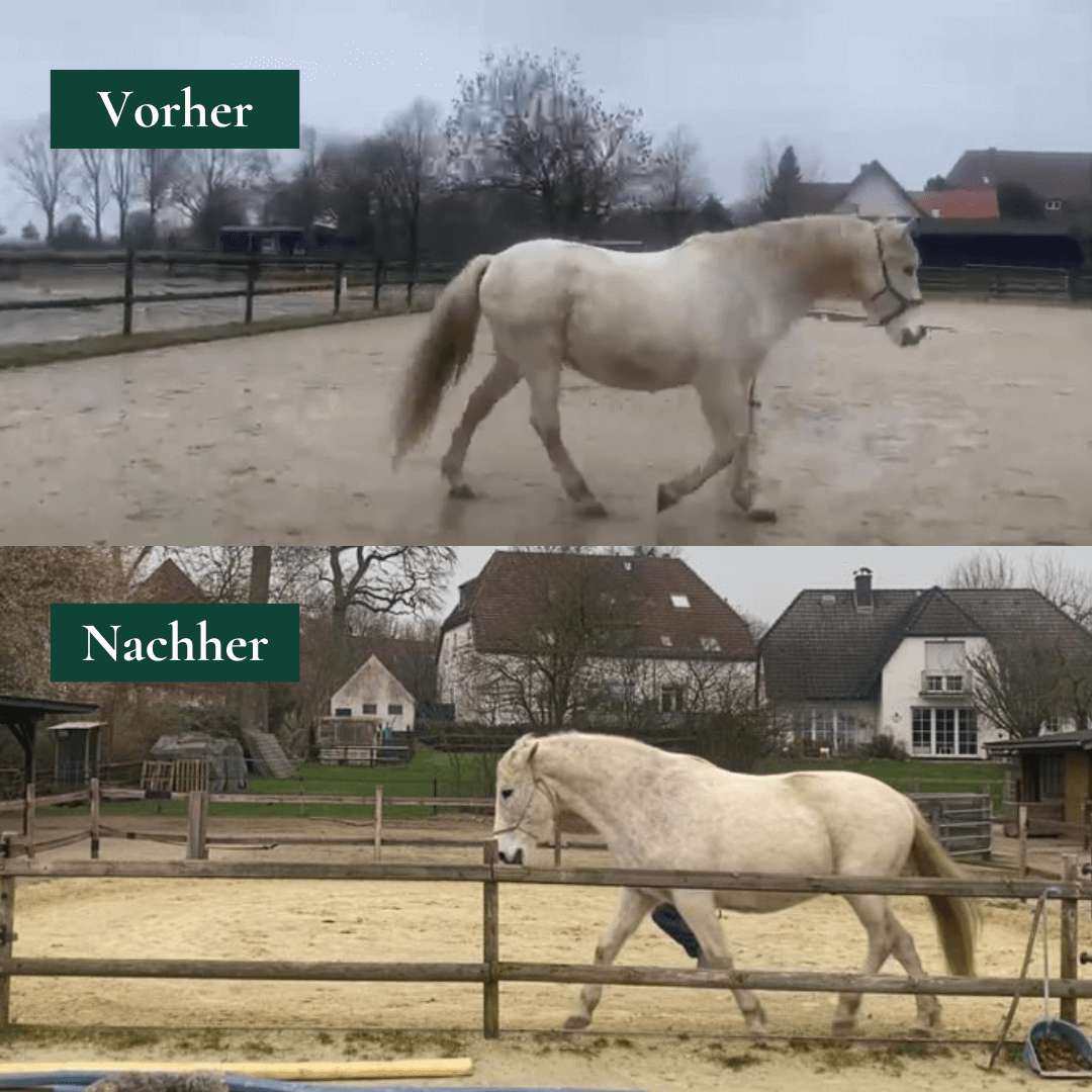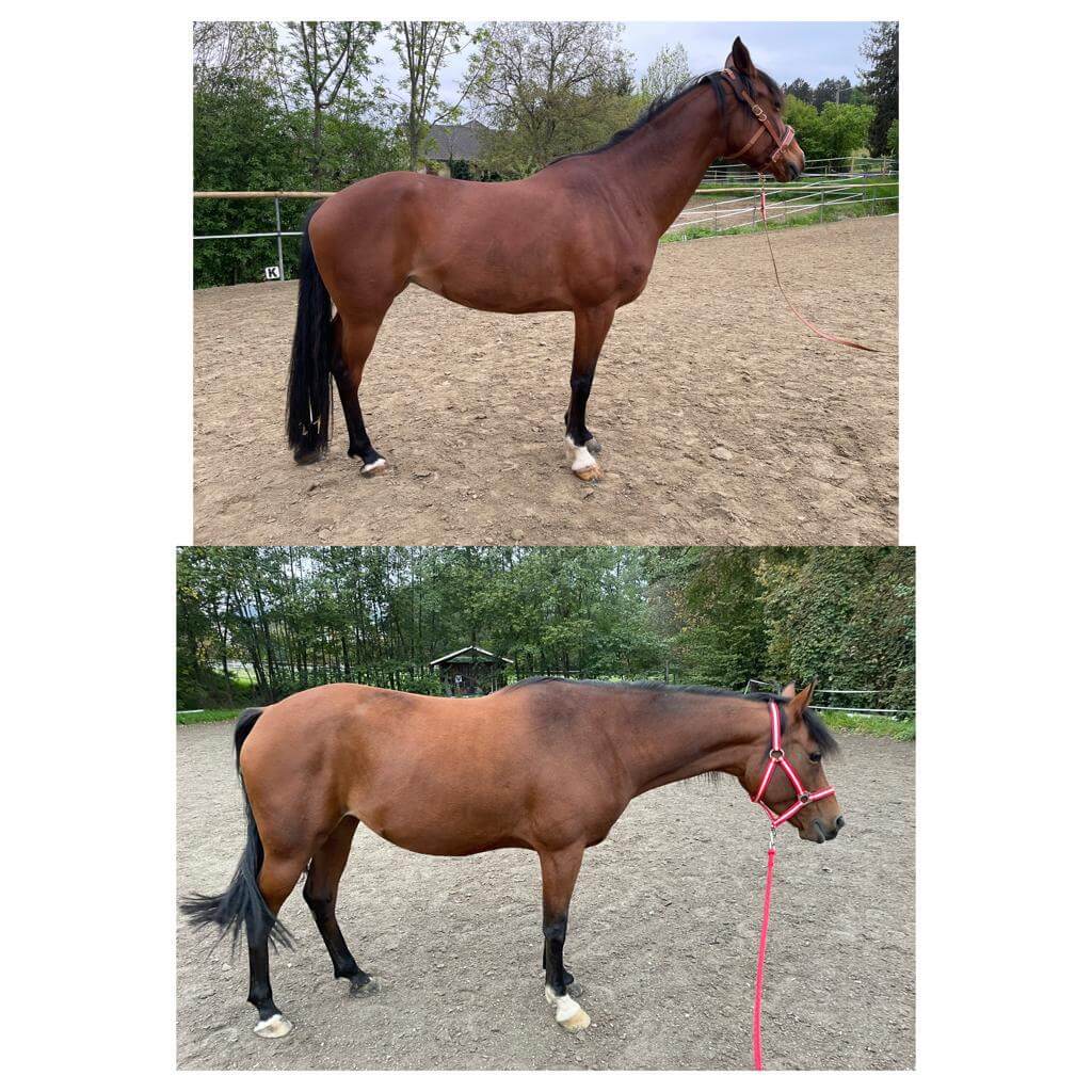 Eine Woche – volle Power auf dein Mindset und zack. Diese Kundin (oberes Bild) hat zum Beispiel einfach ihr Pferd transformiert. Ihr Pferd steht freiwillig geschlossen, nicht mehr so stark rückständig und deutlich entspannter im ganzen Körper. Die Hinterhand hat sich etwas gesenkt und der Rücken hat sich angehoben.