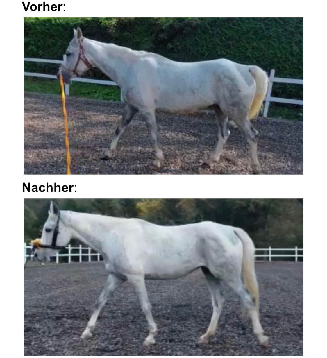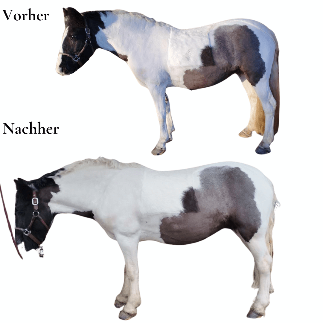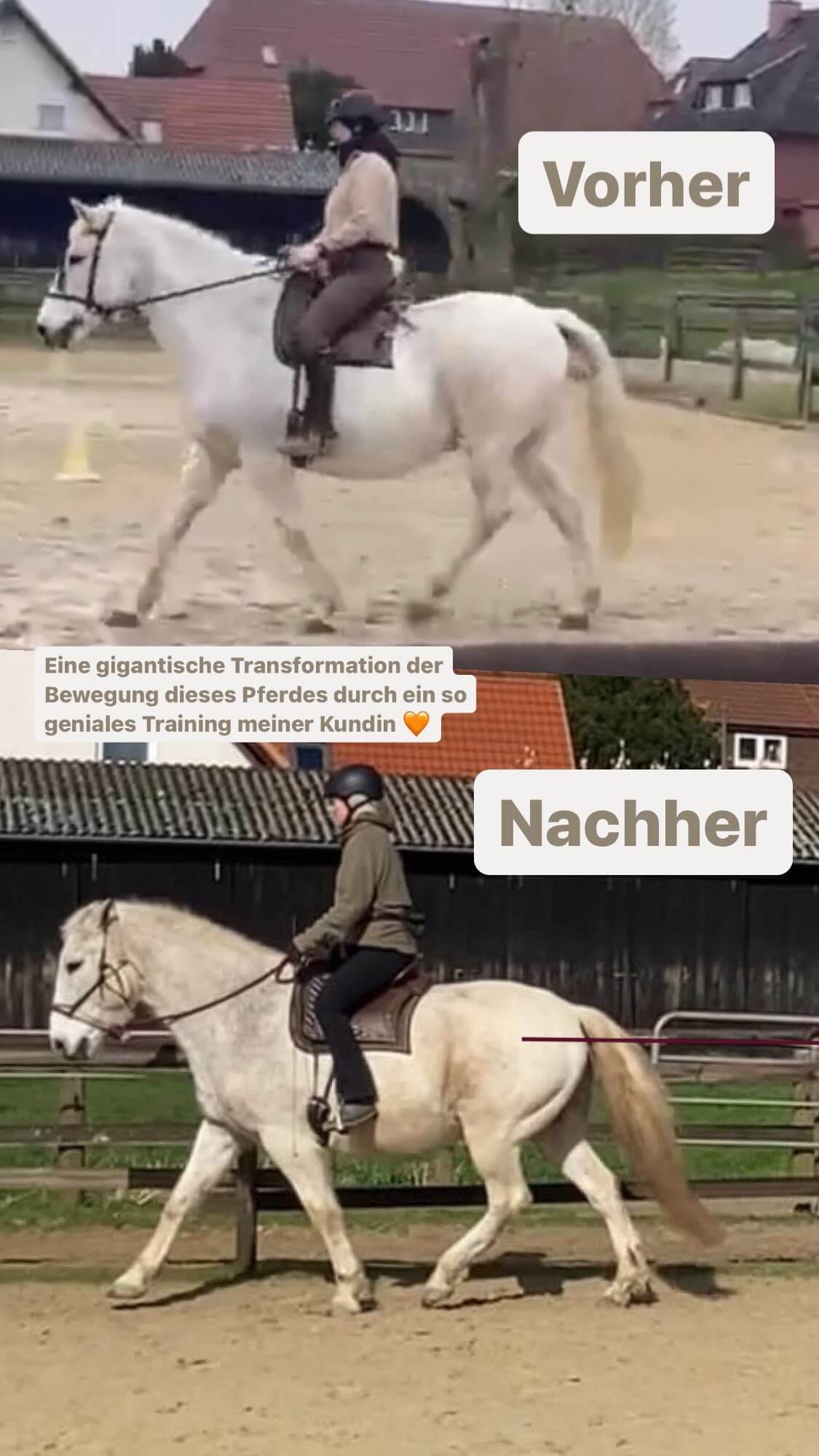Eine Woche – volle Power auf dein Mindset und zack. Diese Kundin (oberes Bild) hat zum Beispiel einfach ihr Pferd transformiert. Ihr Pferd steht freiwillig geschlossen, nicht mehr so stark rückständig und deutlich entspannter im ganzen Körper. Die Hinterhand hat sich etwas gesenkt und der Rücken hat sich angehoben.